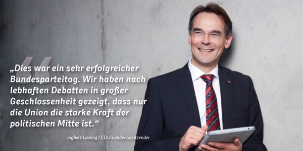 „Dies war ein sehr erfolgreicher Bundesparteitag“, zog der CDU-Landesvorsitzende Ingbert Liebing sein Fazit zum Ende der Tagung in Karlsruhe. „Wir haben nach lebhaften Debatten in großer Geschlossenheit gezeigt, dass nur die Union die starke Kraft der politischen Mitte ist. Angela Merkel hat für ihre Arbeit den breiten Rückhalt der Partei. Auch das ist ein wichtiges Ergebnis dieses Parteitages und das Kontrastprogramm zur SPD, die sich vor wenigen Tagen selbst zerlegt hat.“