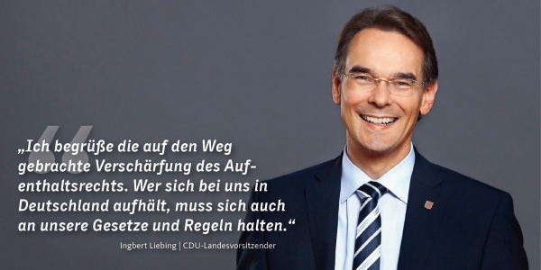 "Die vom Bundeskabinett auf den Weg gebrachte Verschärfung des Aufenthaltsrechts begrüße ich ausdrücklich. Wer sich bei uns in Deutschland aufhält, muss sich auch an unsere Gesetze und Regeln halten", sagte der CDU-Landesvorsitzende Ingbert Liebing heute nach dem Beschluss, die Abschiebung krimineller Ausländer zu erleichtern.